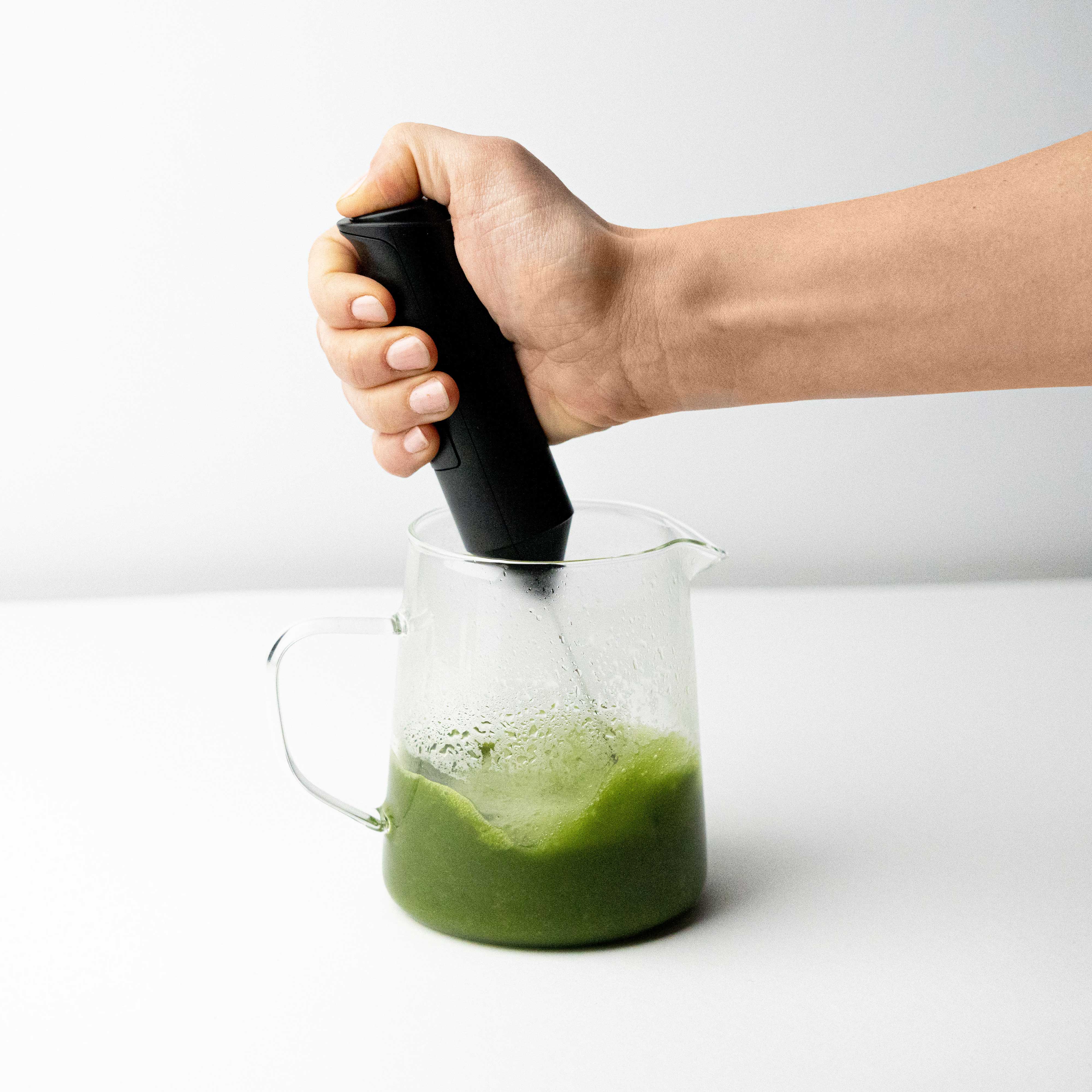 Nun kannst du deinen Matcha mit einem handelsüblichen Milchaufschäumer verquirlen. Am besten lässt du dir dabei etwas Zeit, um zu verhindern, dass Klümpchen entstehen. Nach etwa 30 Sekunden solltest du aber gründlich genug aufgeschäumt haben.