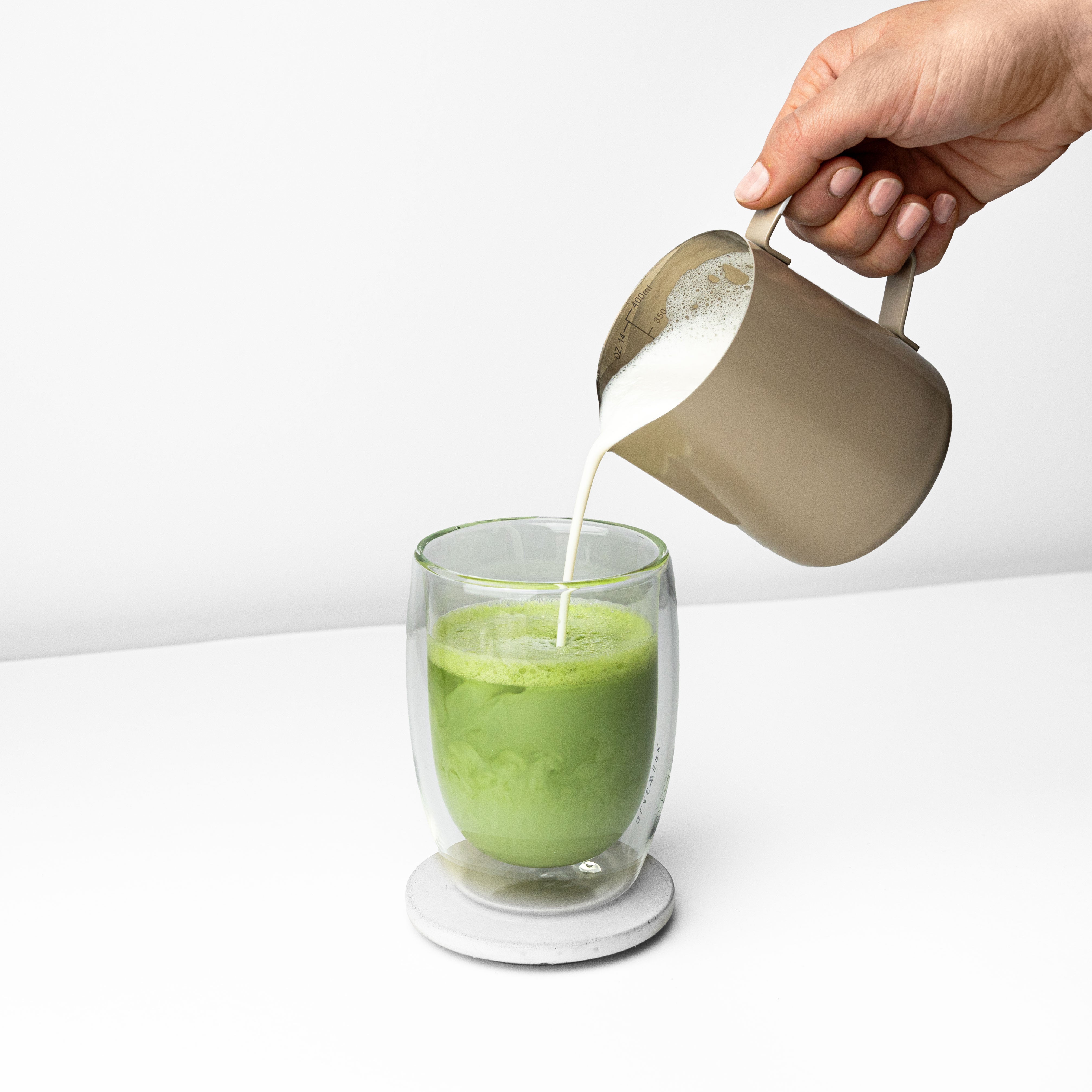 Falls dir ein purer Matcha zu langweilig sein sollte, kannst du ihn mit etwas geschäumter Milch oder Pflanzendrink zu einem leckeren Matcha-Latte aufpimpen.