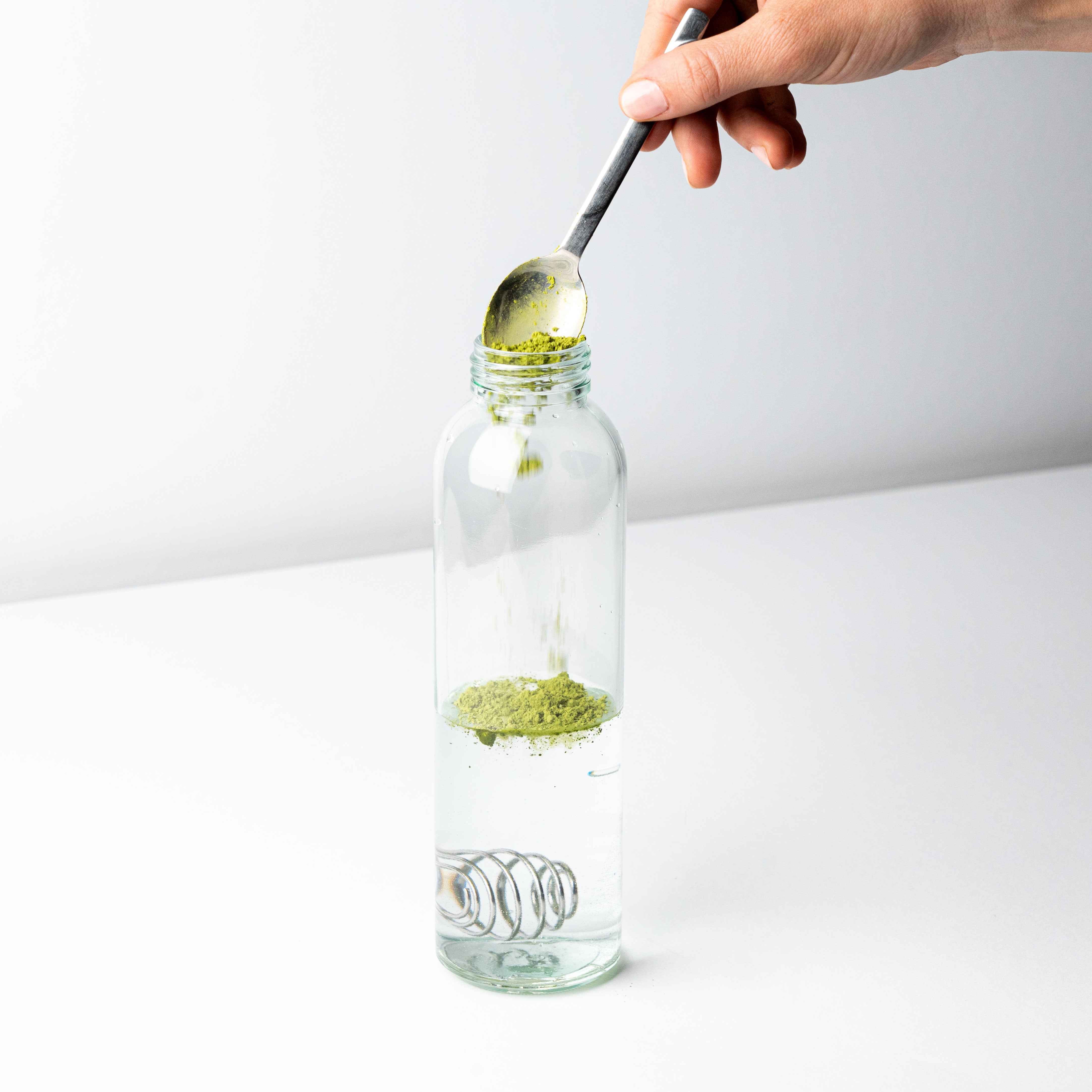 Gib einen leicht gehäuften Teelöffel (ca. 1,5 – 2 Gramm) in einen Shaker mit 200 -300 ml kaltem Wasser. Die Mengen kannst du später je nach Geschmack variieren.