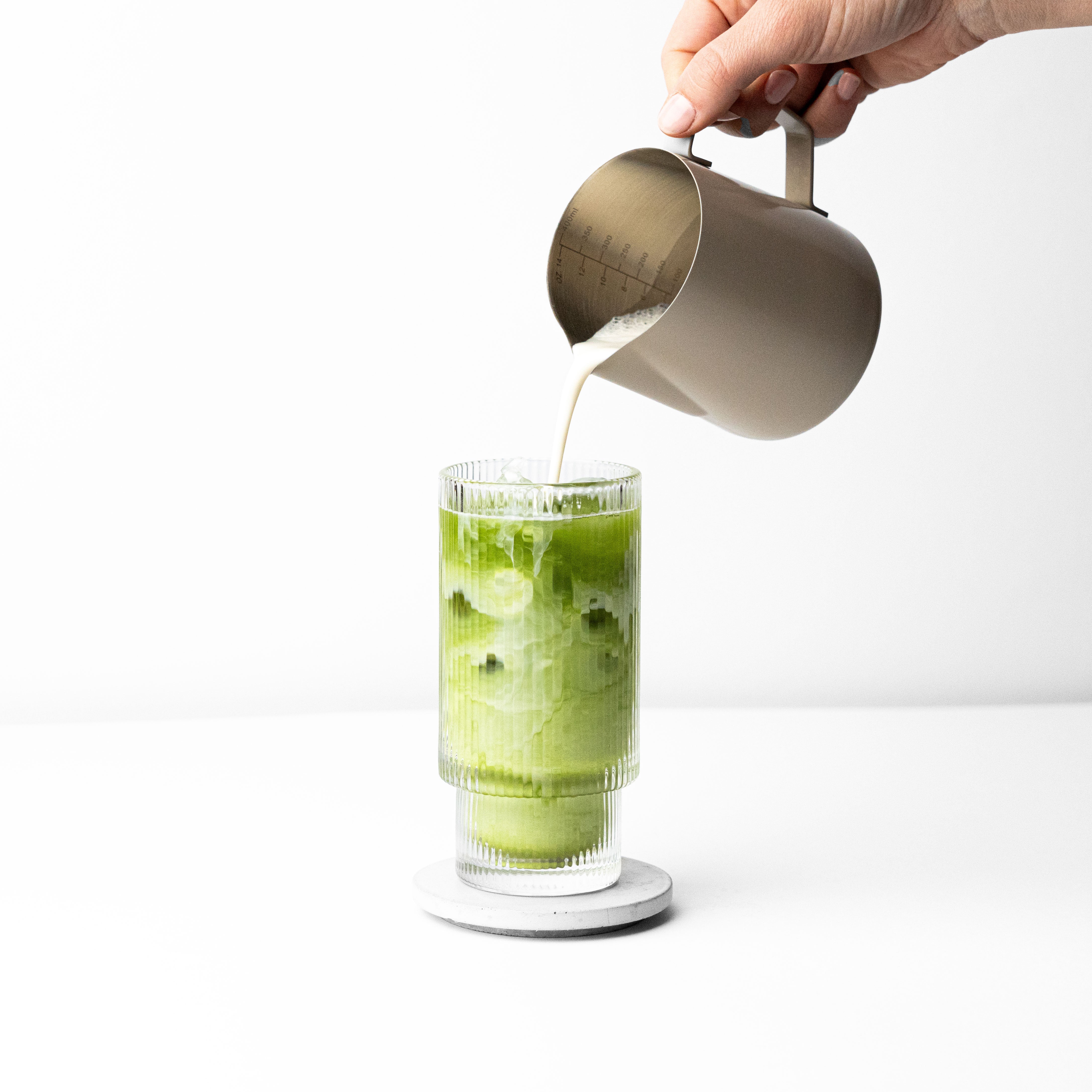 Optional kannst du einen Schuss Milch oder einen Pflanzendrink hinzufügen, um deinen Iced Matcha nach deinem Geschmack zu verfeinern.