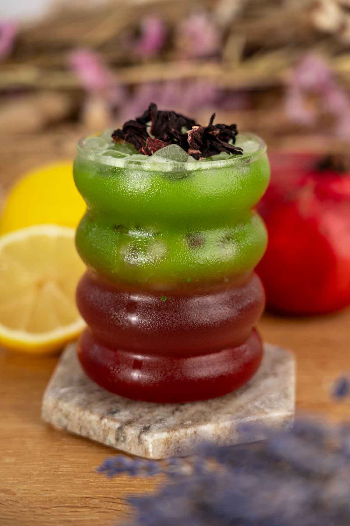 Für den Lavender Matcha Lemonade fülle ein Glas mit Eiswürfeln. Gieße 30 ml Lavendelsirup und 150 ml Mineralwasser mit Kohlensäure hinzu. Füge 50 ml Zitronensaft hinzu. Bereite einen Matcha-Shot mit 100 ml auf 60 Grad heißem Wasser zu. Gieße den Matcha-Shot in das Glas und rühre um. Mit Hibiskusblüten garnieren und genießen!