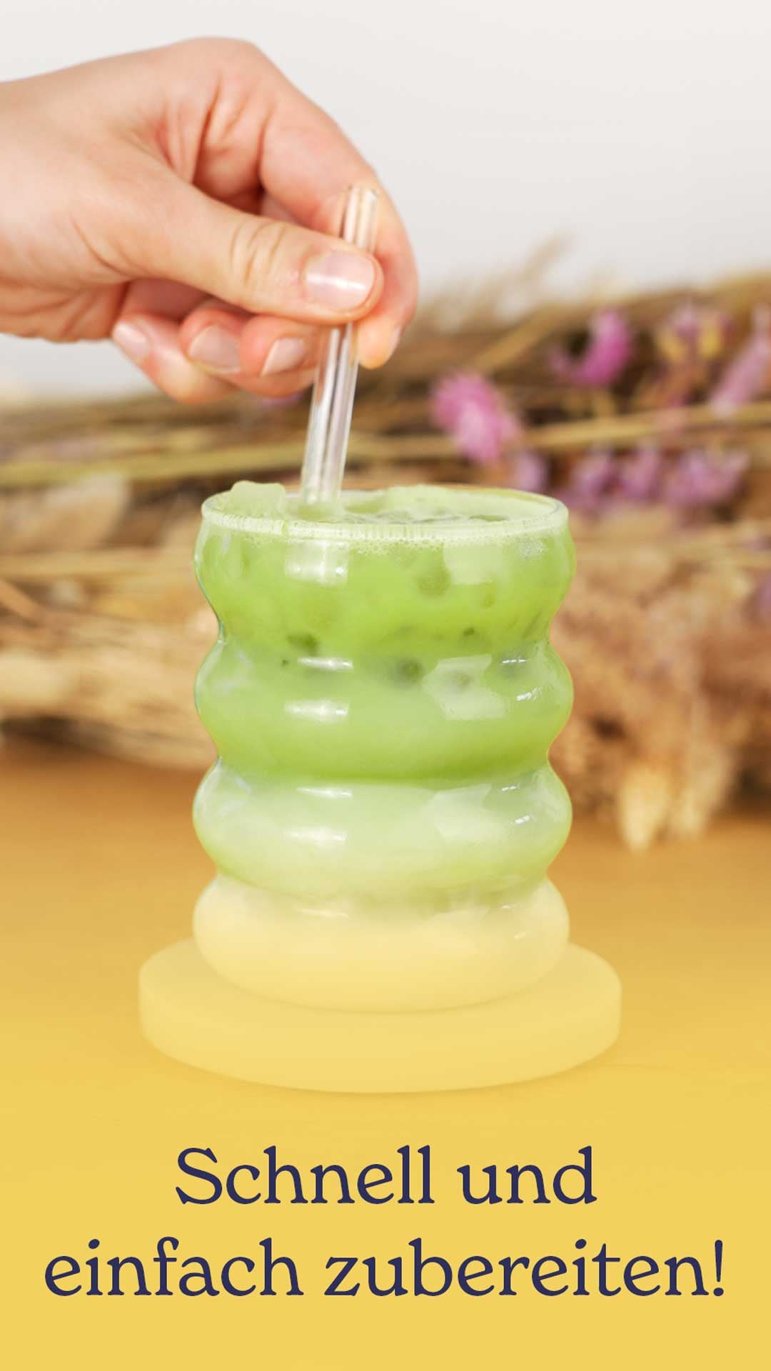 Unser Matcha-Pulver lässt sich schnell in ein leckeres Getränk verwandeln – ob mit Eis, Milch oder Pflanzendrink.